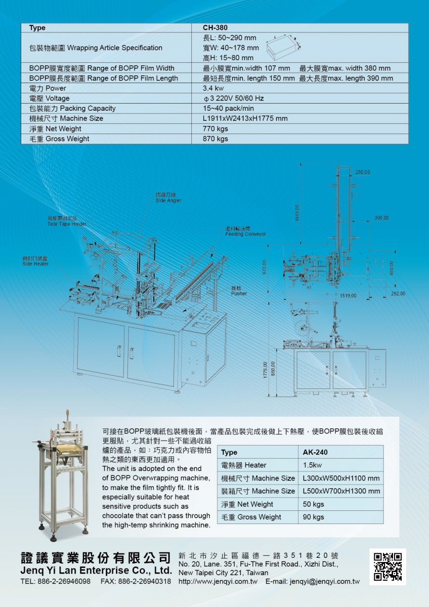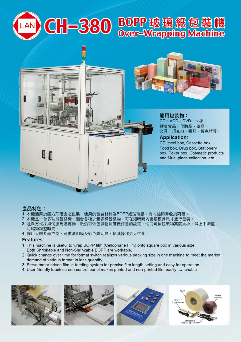 CH380 BOPP玻璃紙包裝機 產品特色: 1. 本機適用於四方形硬盒之包裝,使用的包裝材料為BOPP或玻璃紙,有收縮與非收縮兩種。 2. 本機是一台多功能包裝機 , 適用各種少量多樣包裝物 , 可在短時間內更換模具尺寸進行包裝。 3. 送料方式採用伺服馬達傳動 , 紙張可依包裝物長度做任意的設定 , 切刀可依包裝物高度大小 , 做上下調整 , 可縮短調整時間 。 4. 採用人機介面控制,可做透明膜及彩色膜切換 , 使其操作更人性化。